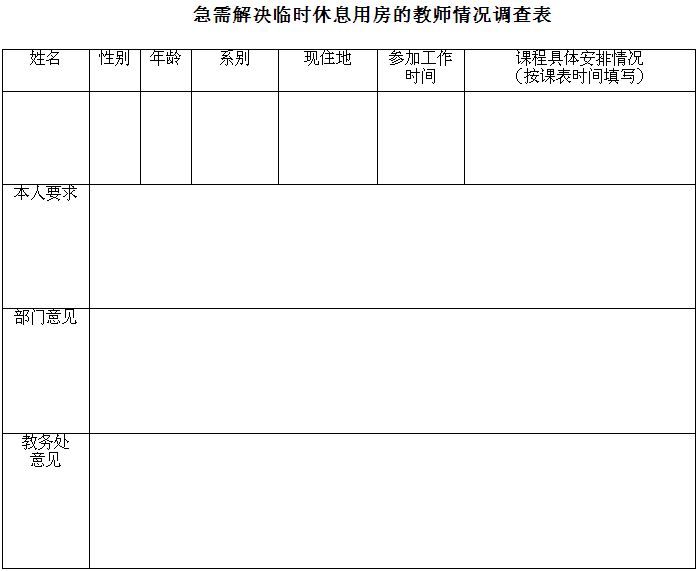 最近,部分教师向学院领导反映,教师往返邓关和汇东之间上课、住宿休息存在困难。学院领导高度重视此事,并指示后勤管理处和后勤服务总公司对此进行调查摸底,为学院提供决策依据。为此,后勤管理处和后勤服务总公司拟对教师住宿和上课情况进行调查,以便学院针对问题,结合学院实际研究解决。现将急需解决临时休息用房的教师情况调查表发给你们,请各系于二OO五年九月二十八日前将调查表交回后勤服务总公司办公室,地点:汇北校区教学楼二楼