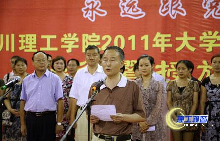 7月6日下午,我校2011年“永远跟党走”大学生暑期社会实践出征暨授旗仪式在汇南校区体育馆隆重举行。校党委书记游建军,副书记唐健禾、李开世,副院长龚敏、刘康,共青团自贡市市委副书记王平出席了仪式。学校相关职能部门负责人,各二级学院相关领导以及18支暑期实践重点团队的全体队员参加了仪式。仪式由校团委副书记张潇文主持。