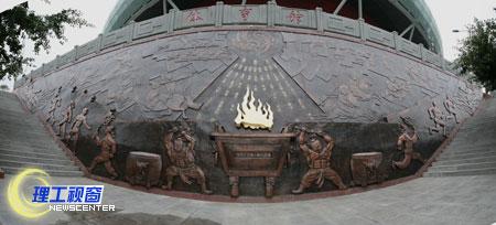 浮雕的锻铜工艺是在铜板上进行创作,利用铜板加热后质地变软,锤打后又恢复坚硬的特性,具有厚实的肌理质感和古朴端庄的审美情趣。《生命.运动.薪火.永传》表现了中国体育的历史和未来,象征生命不止,运动不息的体育本质,表现了人类体育精神源远流长,薪火永传的文化内涵,是校园新的一道靓丽的风景线。
