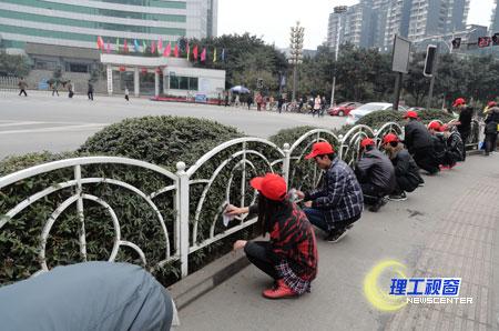 3月2日下午,一群头戴红色小帽的志愿者出现在丹桂大街,他们有的弯腰用钳子捡垃圾,有的负责用水桶接水,还有的用擦布擦洗街道两边的防护栏……他们分工明确,一切都井然有序。初春的三月,还夹杂着丝丝寒意,可同学的心却是热乎乎的。他们是我校各学院的学生干部、党员和优秀团员等组成的学生志愿者。