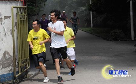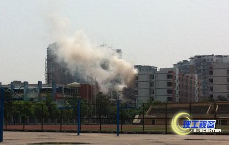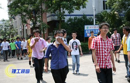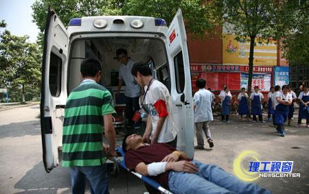 5月9日13:59 分,一股浓烟从汇东校区学生公寓4、7栋冒出,14:00清脆嘹亮的紧急集合号从学校广播中紧急发出,随即,师生们开始迅速有序地从办公楼和学生公寓里紧急向外疏散……其间,四名同学用担架抬着一名“伤者”从学生公寓7栋迅速送往早已等候在食堂旁边的救护车,医务人员立即对伤者进行了急救包扎。