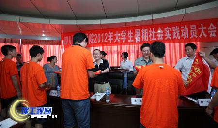 随后,学校领导为各社会实践团队授旗。从领导手里接过鲜艳的社会实践旗帜,同学们踌躇满志,决心在社会实践的大舞台上演绎出青春的光彩。