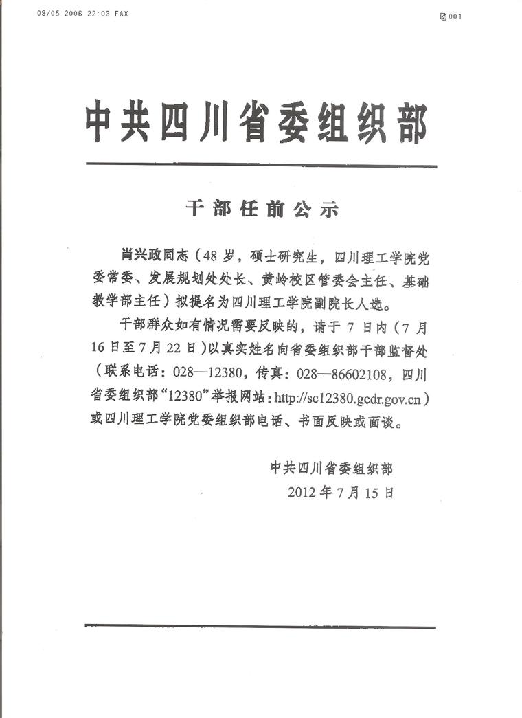 肖兴政干部任前公示