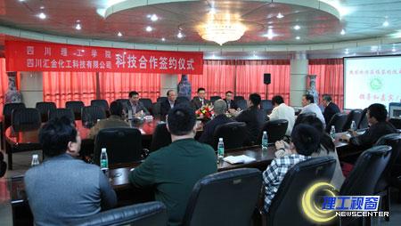 10月18日下午,我校与四川汇金化工科技有限公司科技合作签约仪式在我校行政楼第4会议室正式举行。副院长蔡乐才致欢迎辞。他首先介绍我校教学科研成果,2006年已与自贡市人民政府签订全面合作框架协议,与省内外60余家企业建立的产业技术创新战略联盟已取得了初步成效。他说,我校始终把人才培养、科学研究和服务社会作为指向,坚持把产学研合作作为推进学校转型和实力提升的重要途径和主要突破口,服务地方经济建设和社会发展。