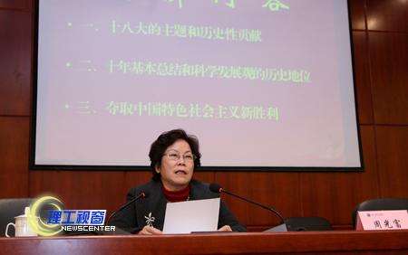 报告会上,周光富以《认真学习贯彻党的十八大精神 不断夺取中国特色社会主义新胜利 》为题,从十八大的主题和历史性贡献、十年基本总结和科学发展观的历史地位、夺取中国特色社会主义新胜利三个方面,对十八大报告提出的新思想、新观点、新论断进行阐述和解读。周光富指出,学习十八大报告要“认清形势看背景、抓住关键看论断、把握重点看新意”,要 树立“忧患意识、创新意识、宗旨意识、使命意识”,要做好“自觉做到坚定理想信念的表率、认真学习实践的表率、坚持民主集中制的表率,弘扬优良作风的表率”。周光富期望全校师生结合自己的学习和工作,把思想统一到十八大精神上来,把力量凝聚到十八大确立的各项任务上去,为建设中国特色社会主义和中华民族伟大复兴提供巨大的人才支撑和智力支持。