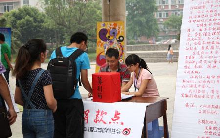 校工会、校团委和校学生会分别发起倡议,通过各种形式进行募捐。记者在现场看到,老师和同学们纷纷自发前来为雅安震区人民捐款,采访中一位同学表示“在今天我们都是雅安人,希望自己的一点爱心能够为灾区重建奉献一份力量。