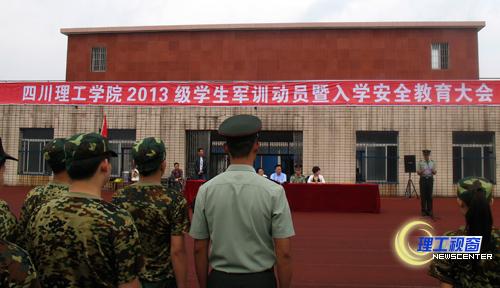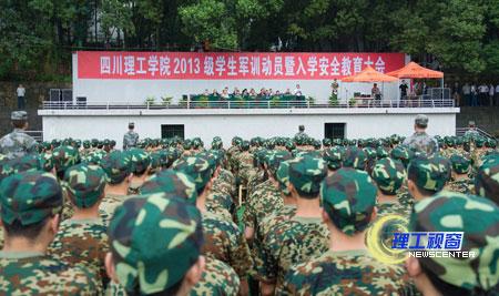 9月12日上午8点30分,2013级学生军训动员暨入学安全教育大会在黄岭校区足球场举行,近6500名新生参加了此次大会。四川理工学院副院长肖兴政,第十三集团军驻自贡某部首长、军训团团长俞金良,学校相关职能部门负责人及二级学院的领导出席了大会。