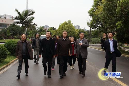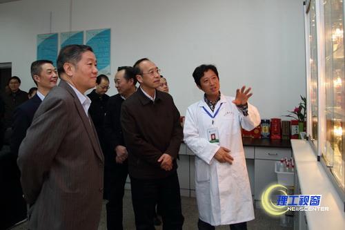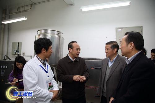在图书馆广场,调研组领导与学校领导合影留念。在参观酿酒生物技术及应用省级重点实验室和酿酒中试车间时,调研组一行听取了生物工程学院副院长罗惠波关于学校坚持走产学研结合道路与企业合作的情况介绍。在酿酒中试车间,调研组一行还品尝了生物工程学院与企业联合研发刚刚实验生产出来的一款脐橙果酒。吴靖平指出,四川理工学院作为省属地方高校就应该紧密结合地方产业特点,大力开展应用型项目研究,与地方产业结构对接,促进地方经济的发展。