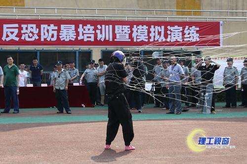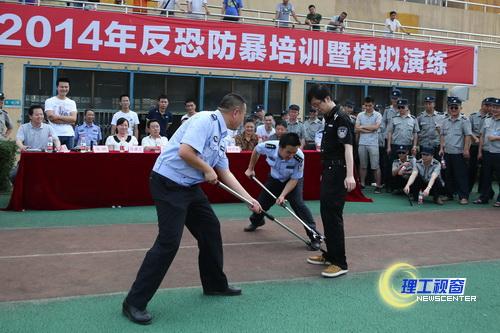 在活动现场,学苑街派出所副所长朱驰向全体参演人员详细介绍了如果遇到暴徒进入校园时应该采取怎样的处置办法和应对措施。他说:“一旦遇到暴徒进入校园,首先是报,即立刻报警,寻求公安机关的支援,同时立即向单位领导汇报;其次是保,即保护好自己和师生的人身安全,迅速疏散学生撤到安全地带,找到安全位置后再寻找工具,在保障安全的情况下进行对抗。”随后,朱驰与市公安局反恐处办公室副主任段松、特警支队二大队大队长周志刚一起,为大家现场演示了盾牌、钢叉、警用棍、辣椒水、网枪等反恐防暴工具的使用方法及安保人员应采取的各种防备办法。