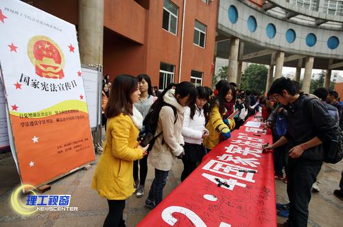 记者在现场看到,机械工程学院精心制作了“学法用法,争做遵纪守法的大学生”,“弘扬法治,传播法治文明”的宣传展板。同学们纷纷在展板前驻足观看。