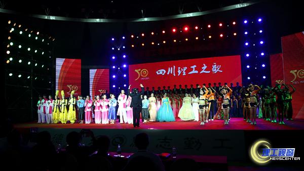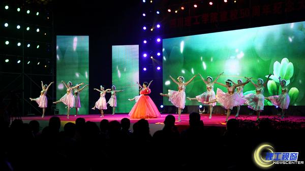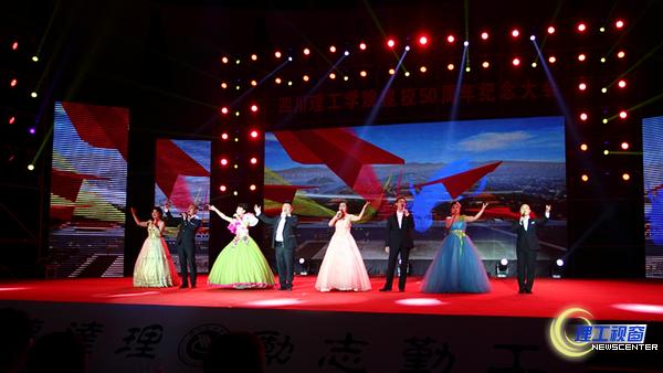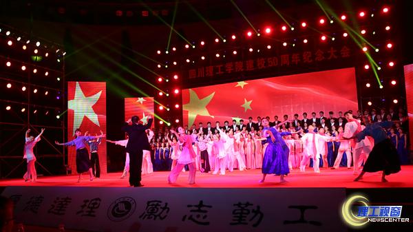 4月17日晚8:00,汇东校区体育馆内华灯闪烁、歌声飞扬、舞姿翩跹,舞台上的LED屏幕美轮美奂,处处洋溢着一派热烈喜庆的气氛。这里正在举行《自强不息的四川理工》——纪念建校50周年文艺演出。学校党政领导唐健禾、李开世、龚敏、刘康,社会各界校友、学校师生代表近2000人齐聚一堂,共同分享和见证学校建校50周年的喜悦和光荣。