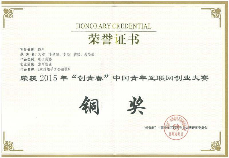 9月20至23日,由共青团中央,中央网信办等主办,由阿里巴巴集团支持的2015年“创青春”中国青年互联网创业大赛总决赛在杭州市梦想小镇举行。我校入围决赛的“自贡市晨曦农业科技有限责任公司”、“灰姑娘手工公益社”2个意向创业参赛项目团队均荣获全国总决赛“铜奖”。
