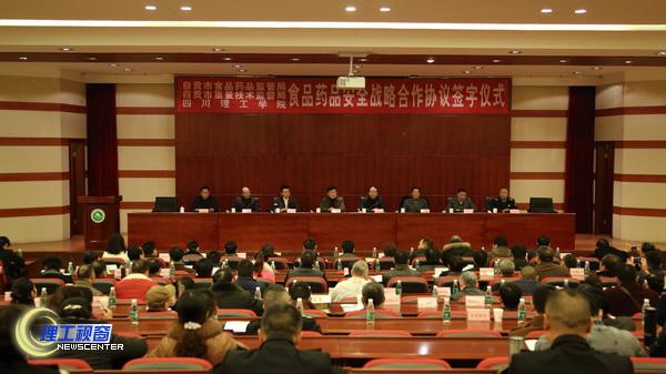 出席并参加签约仪式的还有:自贡市人大党组副书记、副主任王建威,自贡市政协副主席徐武斌,42家食品及食品相关产品生产企业负责人,市药监局、质监局的相关工作人员以及我校生工学院、服地处、科技处等相关部门的负责人和师生代表。会议由自贡市人民政府副秘书长许建平主持。