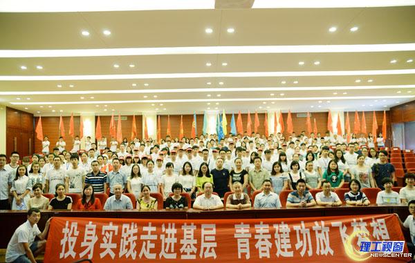 教师代表罗明明、学生代表胡泽林先后在会上发言。与会校领导和相关部门负责人为31支社会实践小分队授旗。