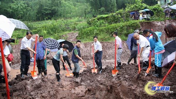 扶贫攻坚,风雨无阻。大雨中,校领导庹先国、龚敏、肖兴政与屏山县各级领导一同,为多功能服务中心铲土奠基。