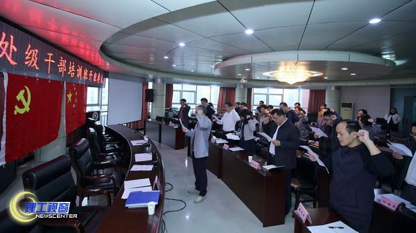 校党委组织部副部长何泽彬首先带领新提拔处级干部面对国旗和党旗庄严宣誓,并就本次培训的内容、具体安排、班委设置进行了讲解,对培训期间的纪律提出了具体要求。