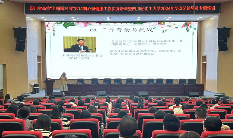 2024年5月9日14时30分,由省心理学会高校心理健康教育专业委员会主办,万象城平台学生工作部(处)承办的四川省高校“名师面对面”第14届心理健康工作务实培训暨万象城平台2024年“5·25”辅导员专题培训讲座在我校宜宾校区举行。教育部高校心理健康教育专业指导委员会委员、电子科技大学心理健康教育中心首席教授李媛到校开展主题讲座。