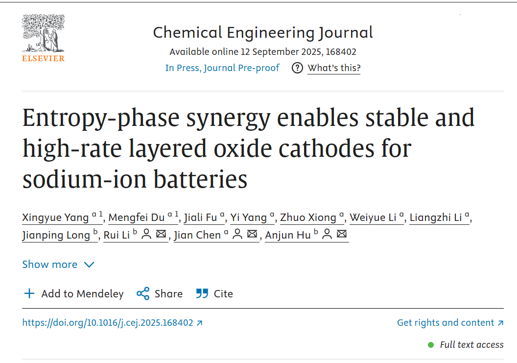 近日,材料科学与工程学院陈建教授课题组研二学生杨星月同学在钠离子电池正极材料研究领域取得重大突破。其研究成果以“Entropy-phase synergy enables stable and high-rate layered oxide cathodes for sodium-ion batteries”(熵-相协同策略实现高性能高稳定性钠离子电池层状氧化物正极)为题,在国际知名学术期刊《Chemical Engineering Journal》(《化学工程杂志》)上发表。《Chemical Engineering Journal》是化学工程与环境技术领域的国际顶尖权威期刊,属于中科院分区一区TOP期刊,最新影响因子高达13.2。