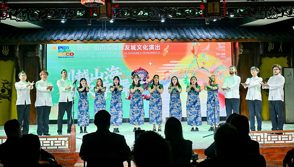 10月17日,四川—伯南布哥州友好城市文化演出在四川省川剧院举行。我校巴西籍交换生、外籍教师及葡萄牙语专业学生共同组成的“中巴合唱团”精彩演绎了经典曲目《茉莉花》,展现了中巴文化的深度交融。巴西伯南布哥州州长里拉、四川省外事办公室主任张涛等嘉宾出席活动。