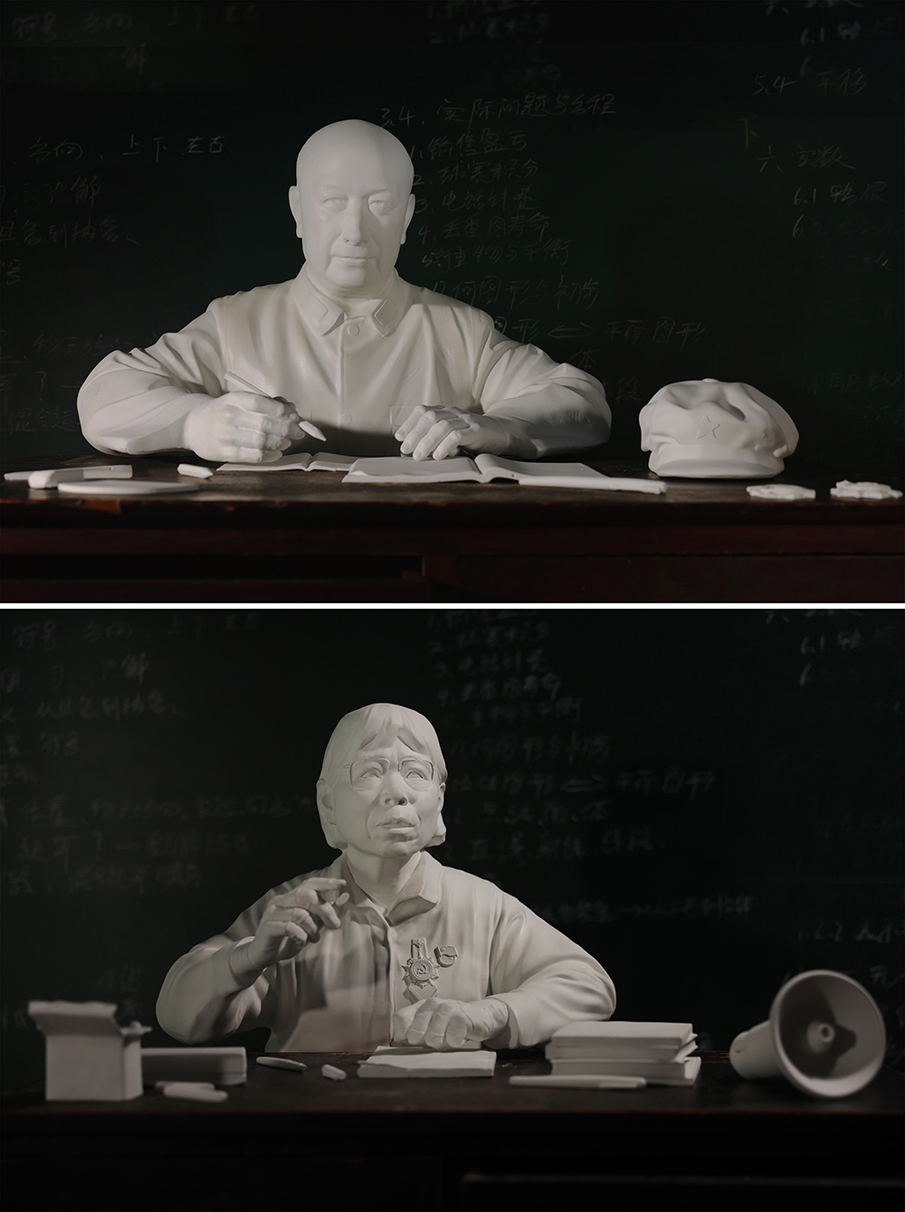 奉光水的《盐都晨集图》以自贡盐业历史建筑和艾叶古镇为素材,通过描绘清晨集市场景,生动反映了乡村振兴为基层群众生活带来的积极变化。马俊的雕塑《国之脊梁·星辰与灯火》则以钱学森与张桂梅为原型,通过简洁有力的造型,塑造出两位“时代楷模”投身科研与教育的动人形象。