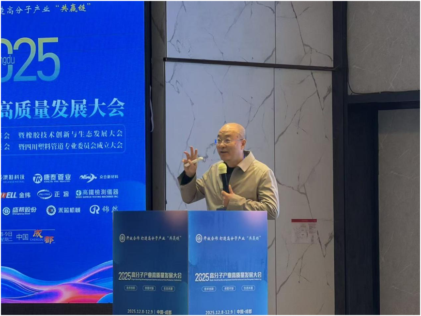 2025年12月8—9日,由成都市高分子产业促进会主办的2025高分子产业高质量发展大会在成都金牛区郦湾国际酒店召开,近500名来自政府、高校、企业的代表齐聚一堂,共同研讨产业高质量发展路径。我校材料科学与工程学院教授、高分子材料服务地方首席专家陈建教授受邀出席,并作题为《炭黑表面赝石墨晶片结构晶片诱导作用—橡胶耐磨性的本质》的主题报告。